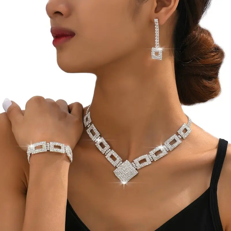 3 Pieces Set: Sparkling Rhinestones Jewellery Set, Earrings and Necklace, Can be Worn as a Hand Chain for Evening Glamour